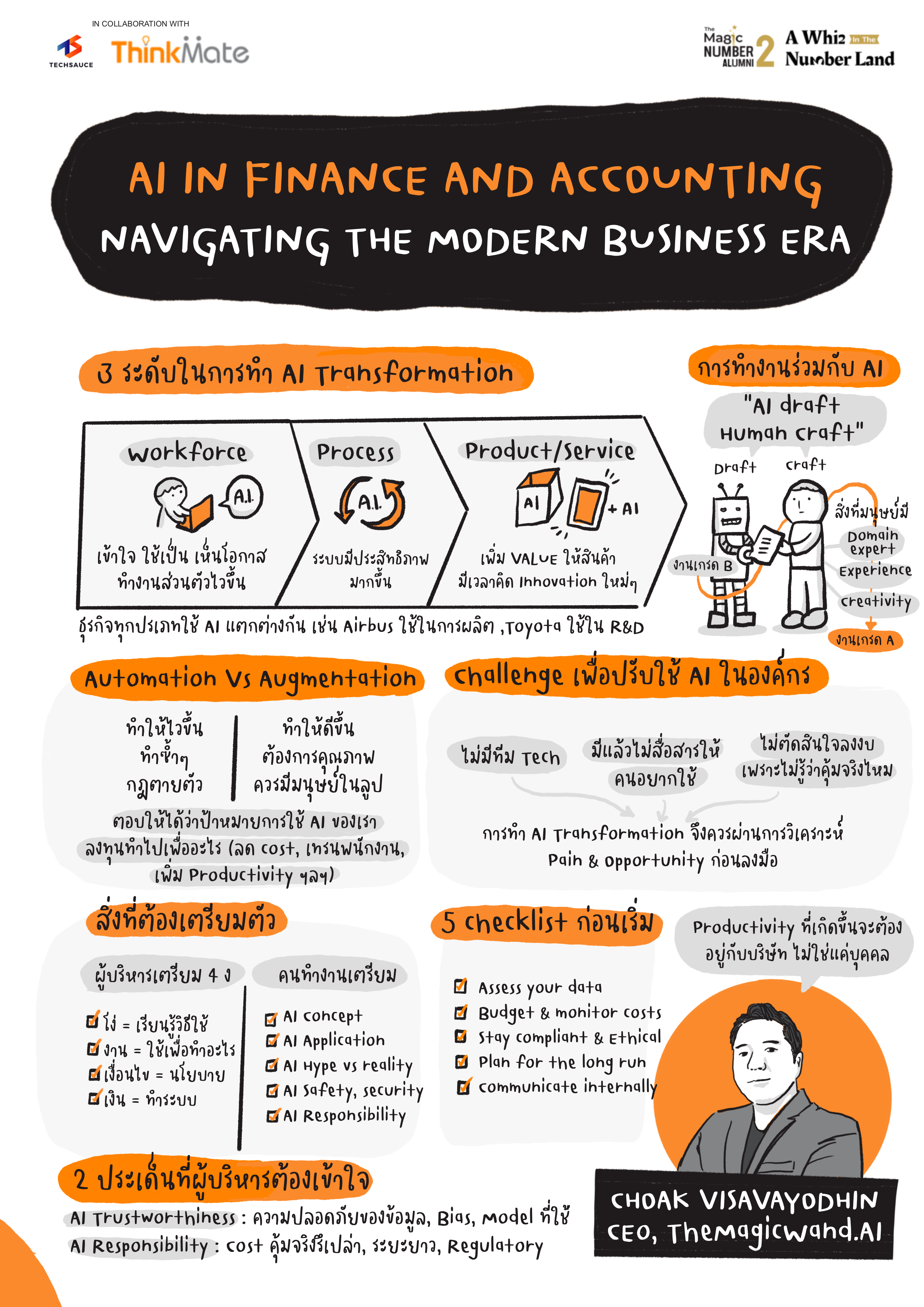 สาระสำคัญของเรื่อง AI กับเรื่องบัญชีและการเงิน คือการเปลี่ยนผ่านการทำงานในรูปแบบ หรือ กระบวนการเดิมๆ ให้ลดความซ้ำซ้อน ลดขั้นตอน และสามารถนำข้อมูลมาใช้เพื่อการตัดสินใจได้รวดเร็วขึ้น ซึ่งเราสามารถ Transformation เรื่อง AI ได้ใน 3 เรื่องหลักคือ (1) Workforce จะใช้เพื่ออะไร ใช่แค่ไหน เห็นโอกาสใดที่ AI จะช่วยทำให้งานเกิดความรวดเร็วขึ้น (2) Process เราจะนำ AI มาเพิ่มประสิทธิภาพระบบงานส่วนไหน และ (3) Product/Service จะใช้ AI เพื่อเพิ่มมูลค่าให้ผลิตภัณฑ์ และนวัตกรรม ได้อย่างไร