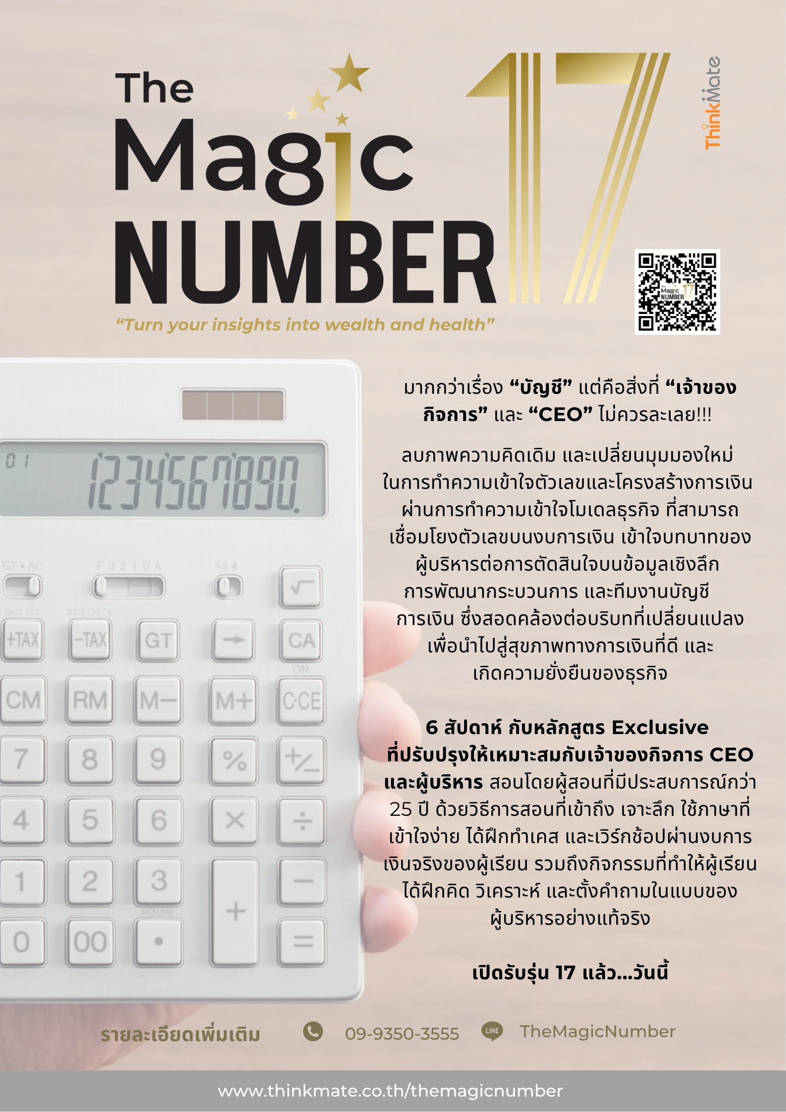 The Magic Number คือหลักสูตรที่พัฒนาขึ้นจากปัญหาที่เกิดขึ้นจริง (Pain Point) ของผู้บริหารและเจ้าของกิจการ ผ่านประสบการณ์การเป็นที่ปรึกษามากกว่า 24 ปี โดยมุ่งเน้นการสร้างระบบทางความคิด การวิเคราะห์เชิงลึกและการนำไปใช้ จากตัวเลขและข้อมูลทั้งทางการเงิน  (Financial Data) และไม่ใช่ทางการเงิน (Non-Financial Data) ในรูปแบบที่เข้าใจง่ายและเห็นภาพที่ชัดเจน