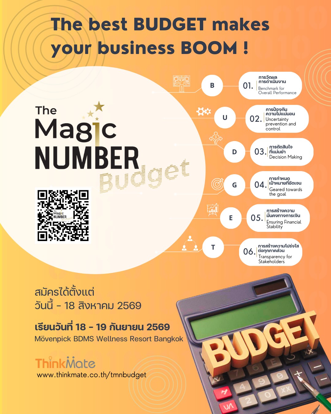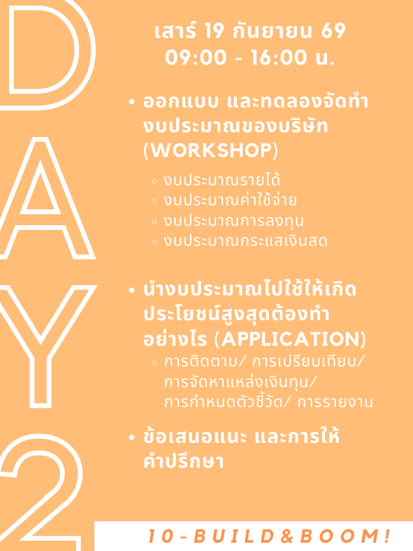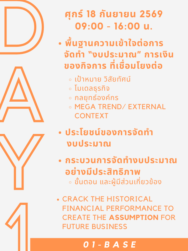 ในโลกธุรกิจที่เปลี่ยนแปลงอย่างรวดเร็ว และไม่แน่นอน การวางแผน "งบประมาณ" ไม่ได้เป็นแค่เรื่องของการทำบัญชี แต่เป็นเครื่องมือสำคัญที่ช่วยให้คุณสามารถเตรียมความพร้อมในการวางแผนธุรกิจให้สามารถเติบโตอย่างมั่นคง และเกิดความยั่งยืน หลักสูตร The Magic Number Budget จะพาคุณไปเรียนรู้ถึงความสำคัญ แนวคิด และกระบวนการจัดทำงบประมาณผ่านการทำเวิร์คช็อป เพื่อให้คุณเห็นโอกาสจากการกำหนดงบประมาณอย่างมีประสิทธิภาพ และผลกระทบจากการที่บริษัทขาดการวางแผนทางการเงินอย่างถูกต้อง เพื่อที่คุณจะไม่พลาดโอกาสในการปรับปรุงกลยุทธ์ทางการเงินของคุณ และสามารถสร้างพื้นฐานที่แข็งแกร่งสู่การเติบโตในอนาคต