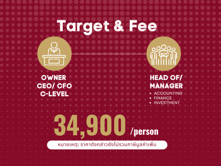 *** เพื่อให้เกิดประสิทธิผลในการเรียน และการนำไปประยุกต์ใช้ให้เกิดความเข้าใจที่ถูกต้องและเท่ากัน ผู้สมัครควรเข้าร่วมหลักสูตรอย่างน้อย 2 ท่าน โดยเป็นเจ้าของกิจการ CEO หรือ ผู้บริหาร 1 ท่าน ที่ทำหน้าที่กำหนดเป้าหมายและกลยุทธ์ขององค์กร และอีก 1 ท่าน ควรเป็นผู้ที่มีบทบาทในการรับผิดชอบเรื่องบัญชี การเงิน หรือบริหารธุรกิจ ที่เข้าใจ เกี่ยวข้อง และใช้ข้อมูลทางการเงินเป็นประจำ