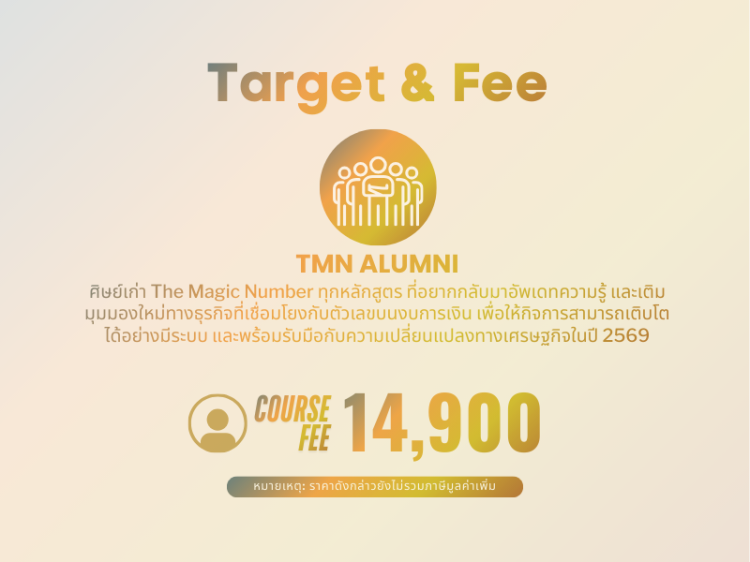 หลักสูตร Super Exclusive 1 วันเต็ม ที่จะช่วยให้บรรดา TMN Alumni ได้กลับมาทบทวนและตอกย้ำความสำคัญของ “ตัวเลข” ที่คุณเคยรู้มา...ว่ามีเรื่องใดที่เปลี่ยนแปลงหรืออัพเดทอย่างไร พร้อมทั้งเติมความรู้ใหม่ในมิติที่หลากหลาย ช่วยให้คุณสามารถวิเคราะห์ ออกแบบกระบวนการอย่างเหมาะสม และเชื่อมโยงไปยังการกำหนดกลยุทธ์ที่เกี่ยวข้องกับโครงสร้างทางการเงิน ... กับบรรยากาศ การเรียนรู้ที่เป็นกันเอง กิจกรรมที่ทำให้คุณเหมือนได้ย้อนกลับไปรู้จัก The Magic Number วันแรก และกรณีศึกษาที่คัดมาแล้ว ซึ่งจะช่วยให้คุณเห็นมุมมองในมิติที่แตกต่างออกไป เพื่อให้ตัวเลขงบการเงินของคุณในปี 2569 นี้ มีความหมายและมีพลัง พร้อมรับมือมือกับความเปลี่ยนแปลงทางเศรษฐกิจในปัจจุบันที่มีความท้าทายมากขึ้น