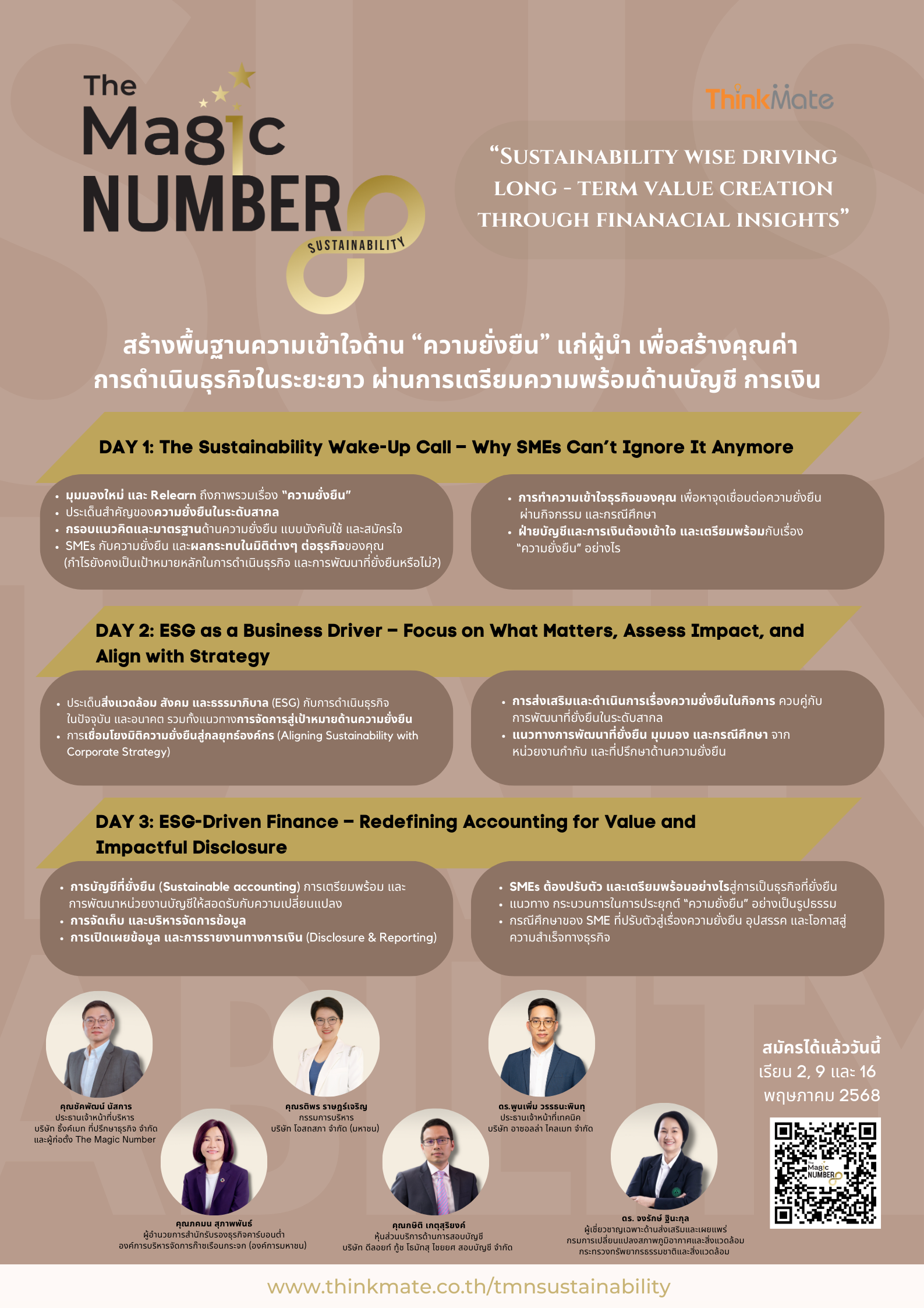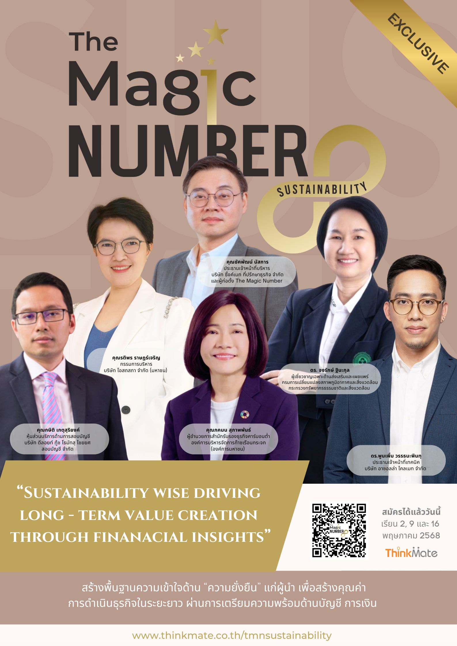 The Magic Number Sustainability จะช่วยให้คุณ ได้เข้าใจที่มาที่ไปของความยั่งยืน แนวทางการปรับตัว กระบวนการสร้างวัฒนธรรม เครื่องมือสำคัญของการลงมือทำเรื่องดังกล่าว ตลอดจนกฎระเบียบที่เกี่ยวข้อง เพื่อให้คุณสามารถนำไปประยุกต์ ออกแบบกลยุทธ์ขององค์กรอย่างมีประสิทธิภาพ เชื่อมโยงกับข้อมูลทางการเงิน และชี้วัดได้จริง ส่งผลต่อการสร้างมูลค่า และการเติบโตในระยะยาว